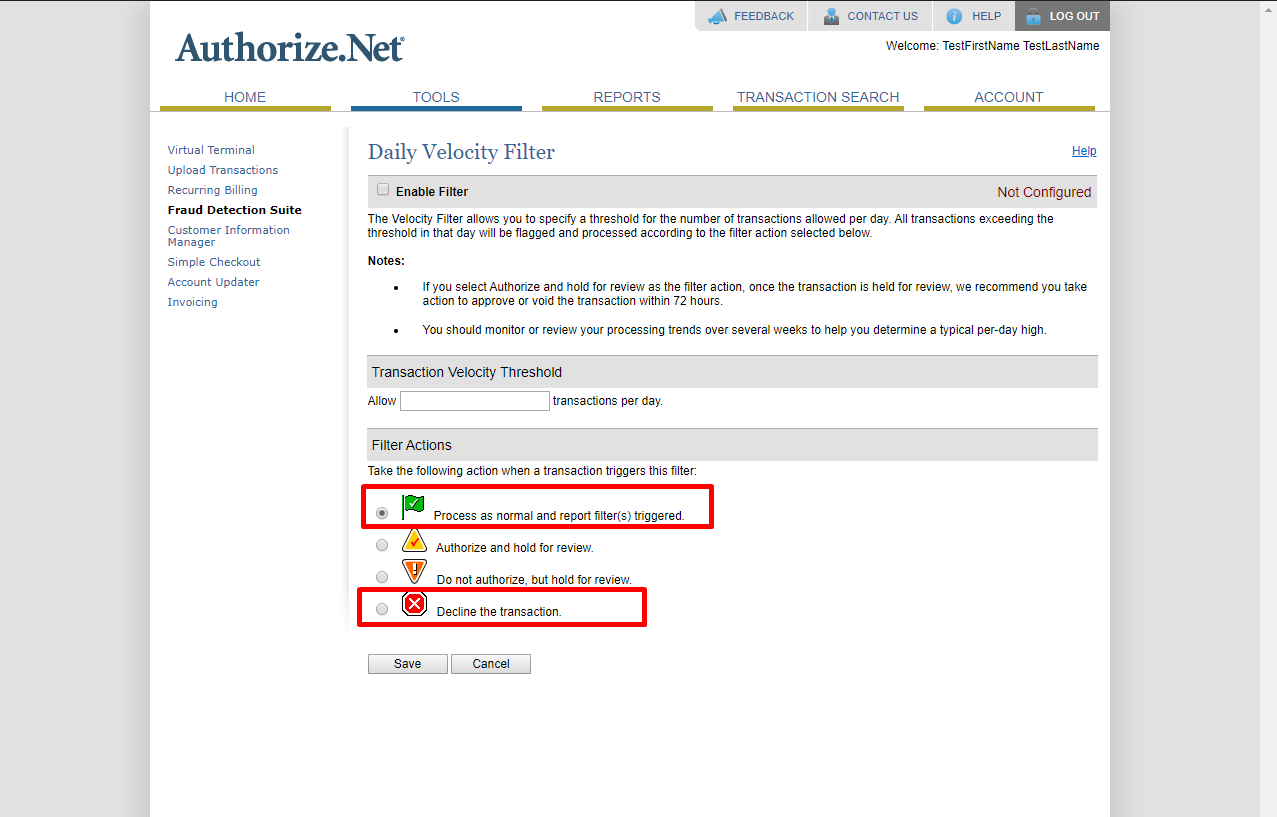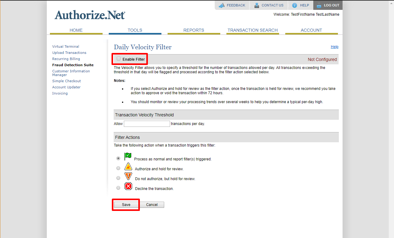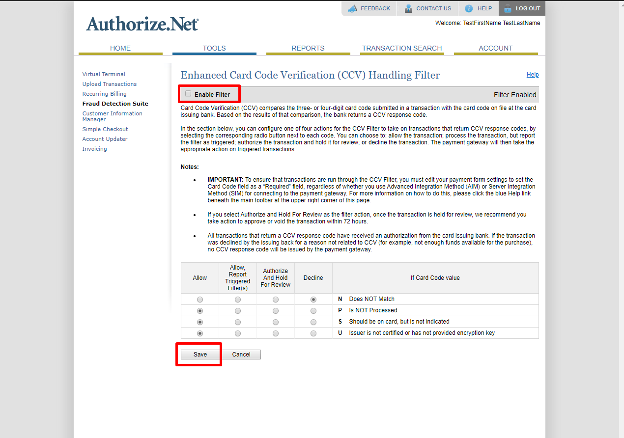 You can customize the behavior you wish for your store. However, please note that if the data entered when storing a credit card does not meet the filter requirements, it will not be stored. If you are unsure how to proceed or do not know what each of the fields in this section mean, you can contact Authorize.Net for clarification or simply disable the filter by making sure the Enable Filter checkbox is unchecked. Once the filter is disabled, don’t forget to click the Save button at the bottom of the page.
