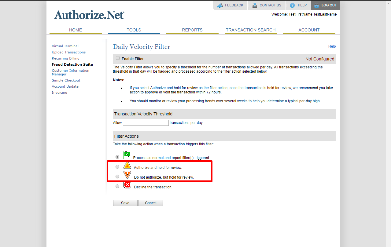 If you use Authorize and hold for review. OR Do not authorize, but hold for review. Enlite may receive an error response at the time the charge is processed and will not apply any payments to the invoices. Both settings hold the transaction to be reviewed by you at a later time from the Authorize.Net portal. If you approve them, or in some cases, after a certain period of time they are automatically approved, Enlite will not be notified that the transaction has gone through. This means that your customer will be charged, but the invoices will not be marked as paid in Enlite. If you choose to keep either of these settings, you must go back into Enlite and mark the invoices related to that charge as paid. As mentioned above, the simplest solution is to just disable these filters.