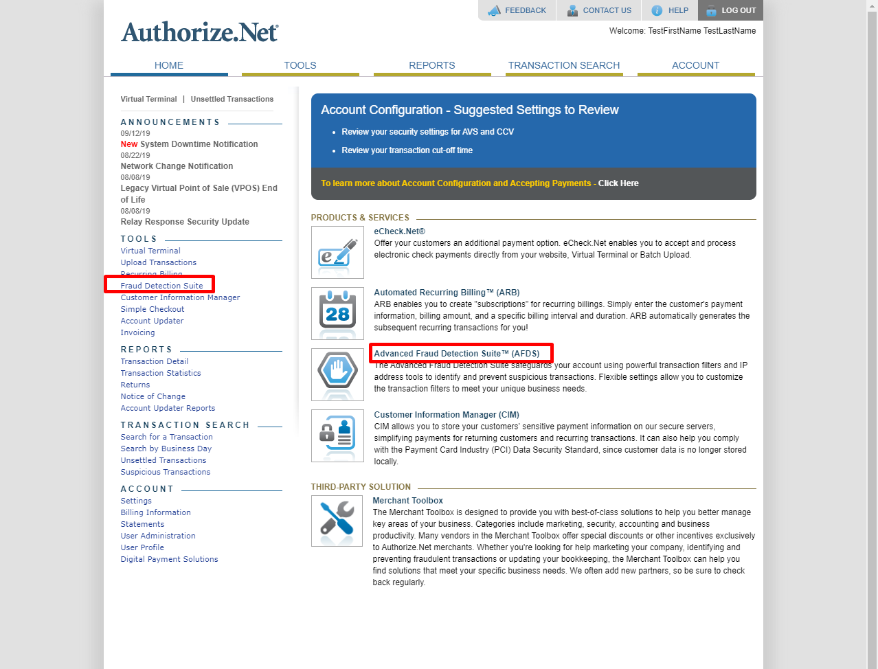 - Enter AFDS from your login page. By clicking on AFDS under Products & Services, or selectin the Fraud Detection Suite from the navigation bar on the left side.
