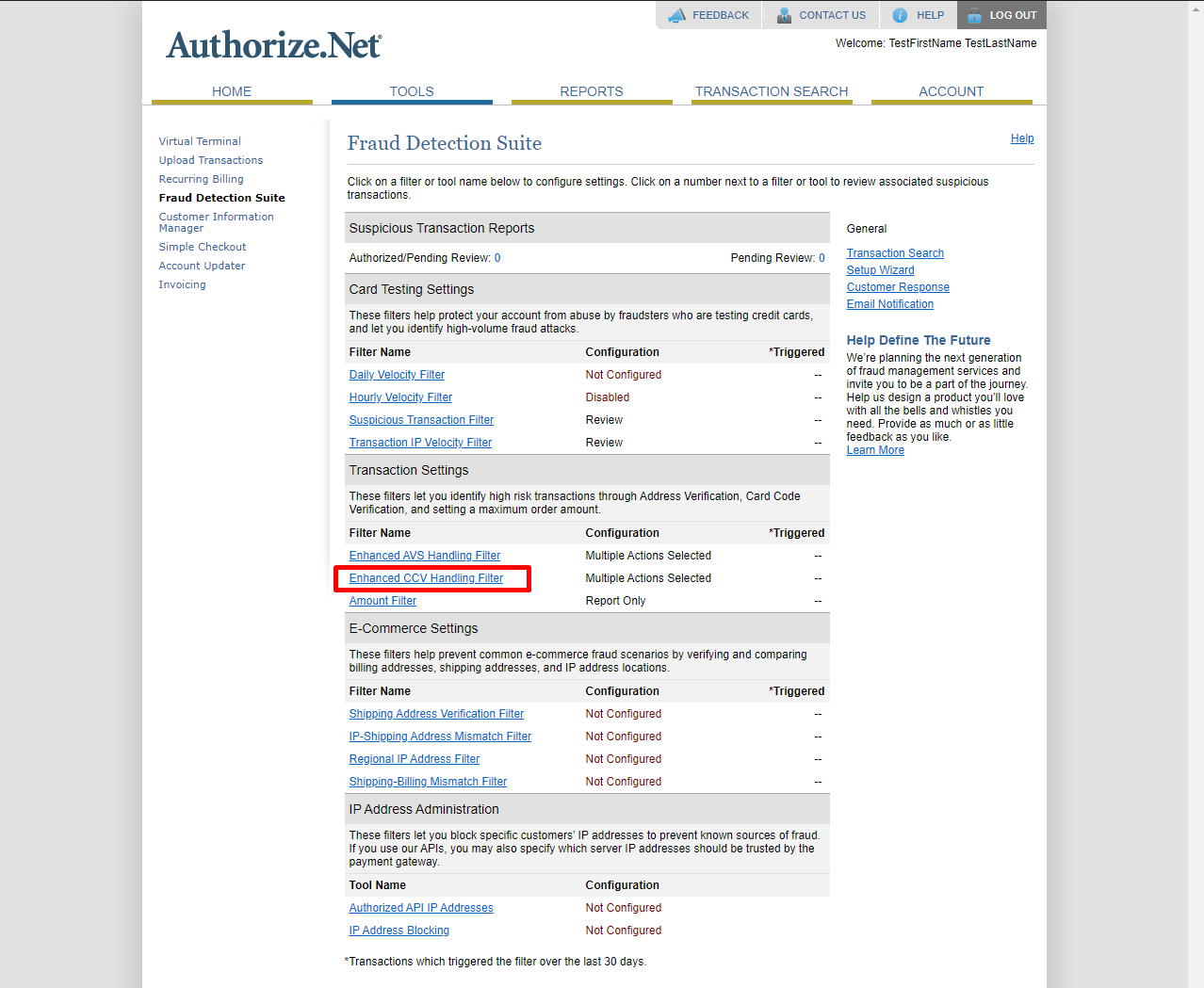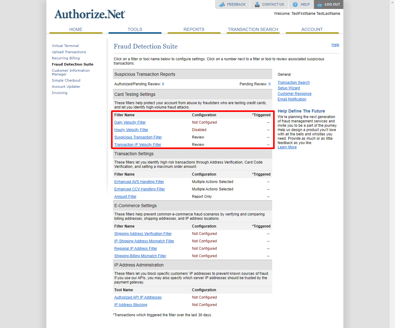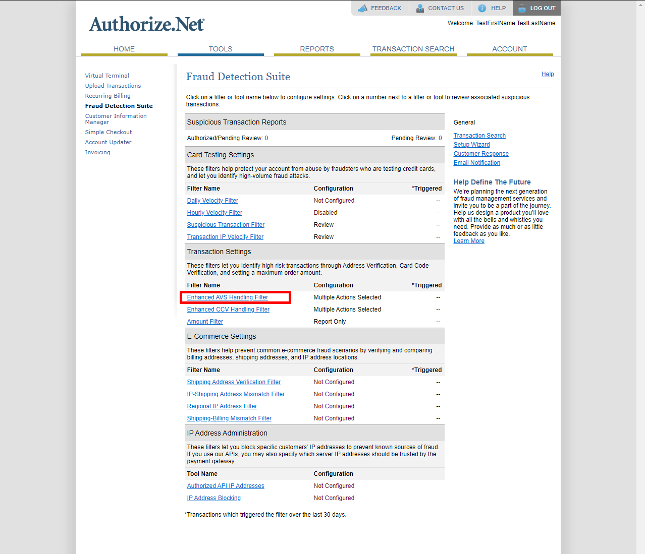 The Authorize.Net Advanced Fraud Detection Suite (AFDS) provides several tools to prevent suspicious transactions. However, some of these filters may interfere with Enlite’s functionality. A common example is the velocity filter which prevents many transactions from occurring in a short amount of time. In Enlite, if you have many billing customers set up and charge their credit cards at once, a transaction for each customer will be processed rapidly. This is the desired behavior, however, it may get flagged by AFDS and interfere with charging your customers. Below are our recommended Settings.