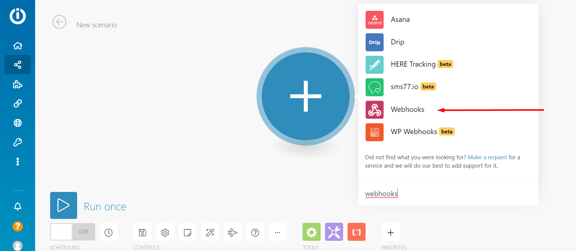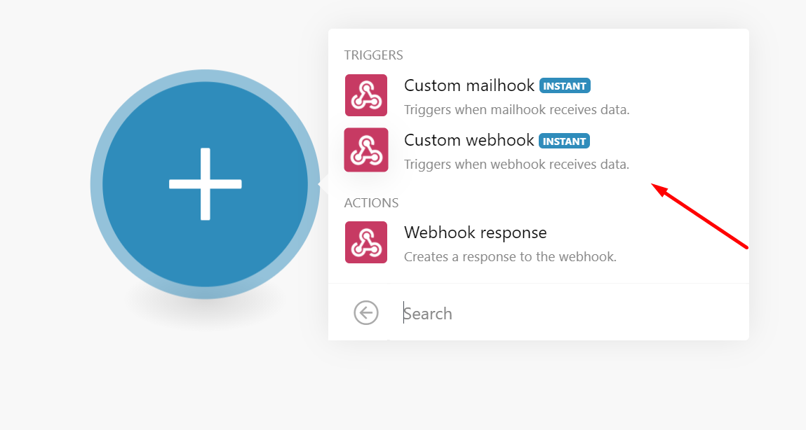 - Hit the "+" button and select "Webhooks". Hit the "Custom Webhooks" option.