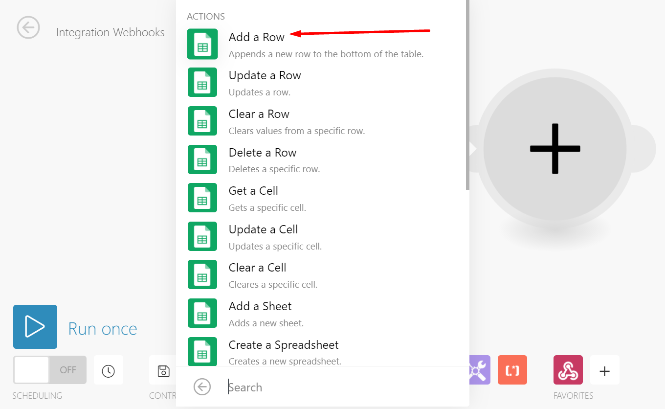 - Go back to Integromat, add another module and select Google Sheets(Or QuickBooks, or any other destination)